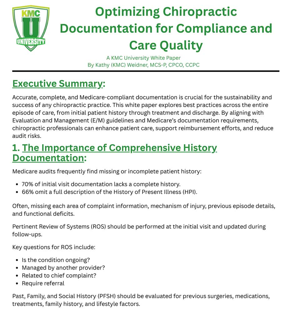 Stronger documentation means stronger protection for your practice. Kathy Weidner of KMC University breaks down exactly what Medicare and auditors look for at every stage of care—from initial history to treatment plans, SOAP notes, and discharge summaries. This white paper is packed with practical guidance to help you close compliance gaps, improve patient care, and protect your reimbursements. A must-read for every chiropractor and team.